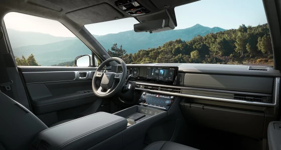 Der große Innenraum des neuen SANTA FE bildet einen Kontrast zum starken Äußeren. Das Innendesign betont die horizontalen und vertikalen Linien mit einem H-Motiv auf dem Armaturenbrett und den Lüftungsdüsen. Das geschwungene Panoramadisplay und die zwei induktiven Ladestationen für Smartphones vermitteln ein Gefühl von Luxus und Komfort.